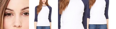 - Contrast color three-quarter sleeves and three-eighths inch neck binding