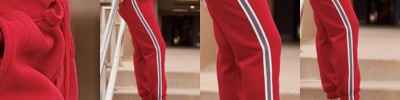 - Banded, Topstitched collar with red trim at neck seam