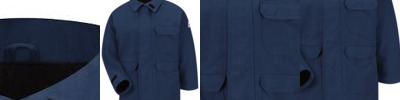 10 oz., heavy-duty cotton duck; Heavyweight quilt-lined taffeta liner; Water-repellent finish; Triple-needle stitched main seam; Heavy-duty brass zipper with storm flap; Collar snaps for optional hood; Two chest pockets with hook/loop closures; Pleated elbows and action back; Knit cuffs and waistband; Manufactured in a LEED (Leadership in Energy and Environmental Design) certified factory;