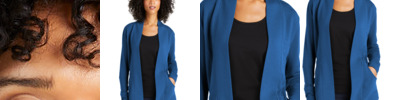A layering must-have made of ultra-soft, snag-resistant microterry-it's as comfortable as it is polished in appearance. 6.8-ounce, 62/33/5 poly/rayon/spandex microterry Snag-resistant Tag-free Open front cardigan Interior drawcord with toggles at waist Front pockets Curved back yoke Front and back seaming details Self-pieced cuffs and hem