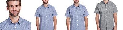 3.4 oz., 100% cotton yarn dyed poplin; popular ginghan microcheck; semi-fitted styling; soft-collar styling; short-sleeve; Oeko-Tex® Standard 100 certified; WRAP certified;