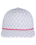 88% polyester, 12% spandex waterproofed; reload; 5-panel construction; Slightly curved bill with rope; Adjustable snapback closure; This unique Swannies design includes a Swannies rubberized logo patch on the front of the hat, not removable;