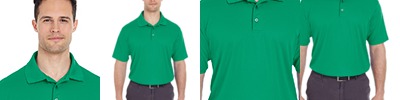 4.1 oz./yd2 / 139 gsm, 100% polyester piqué with moisture-wicking, anti-microbial and UV protection performance; Matching flat-knit collar; Heat-seal label; Side slits; Two-button placket;