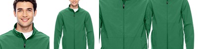 9 oz./yd² / 300 gsm, 96% polyester, 4% spandex bonded with brushed tricot with inner membrane; 3,000 mm waterproof rating; 1,000 g breathability rating; center front dyed-to-match reverse coil zipper with semi-autolock rubber pull tab and chin guard; zippered front welt pockets; open hem cuffs; double-needle stitching at hem and cuffs; open hem with drop back bottom;