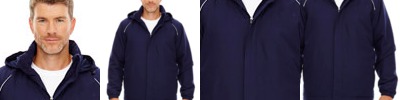 3.5 oz., 100% polyester fully seam-sealed, two-layer waterproof and breathable s; 3.2 oz, Dyed-to-match 100% polyester micro-mesh lining throughout; 6,000 mm waterproof rating and 6,000 g breathability; rollaway three-piece hood with 1¼" rain bill; waterproof reverse coil zipper at center front and pockets with semi-autolock rubber pull tabs; black contrast side panels; reflective tape at right-chest and front pockets; hook and loop hem closures at cuffs; drop-tail hem and elastic shockcord protects from the elements;