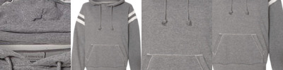 9.75 oz. 70% Polyester, 30% Cotton fleece fabric; Contrast color side gussets and sleeve stripes; Split front pocket pocket; Raglan sleeves; Rib waist, cuffs, and collar; Flatlock coverstitched throughout; Raw-edge seams on pocket;
